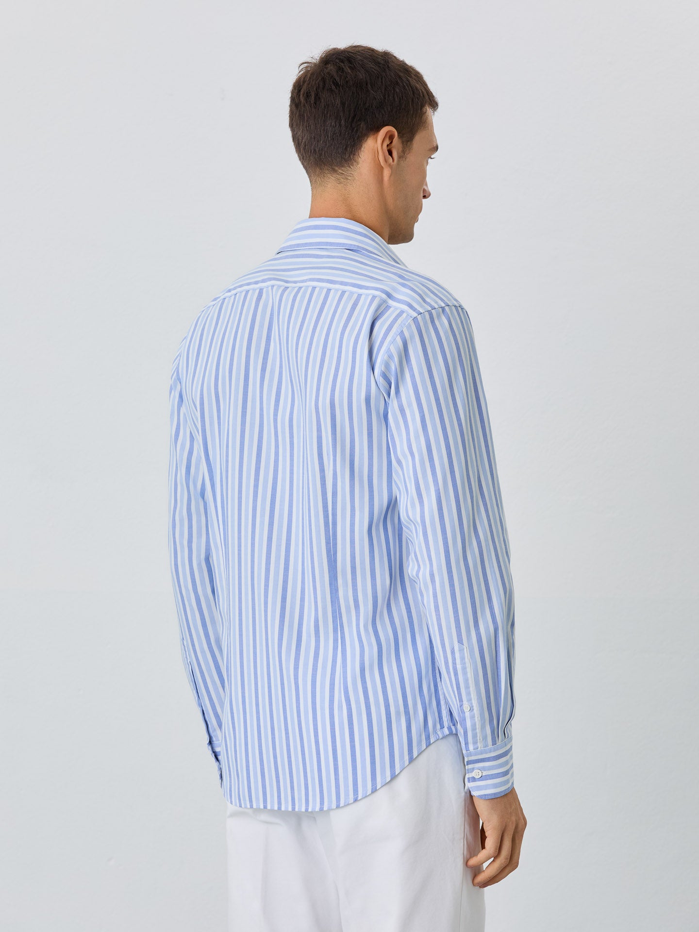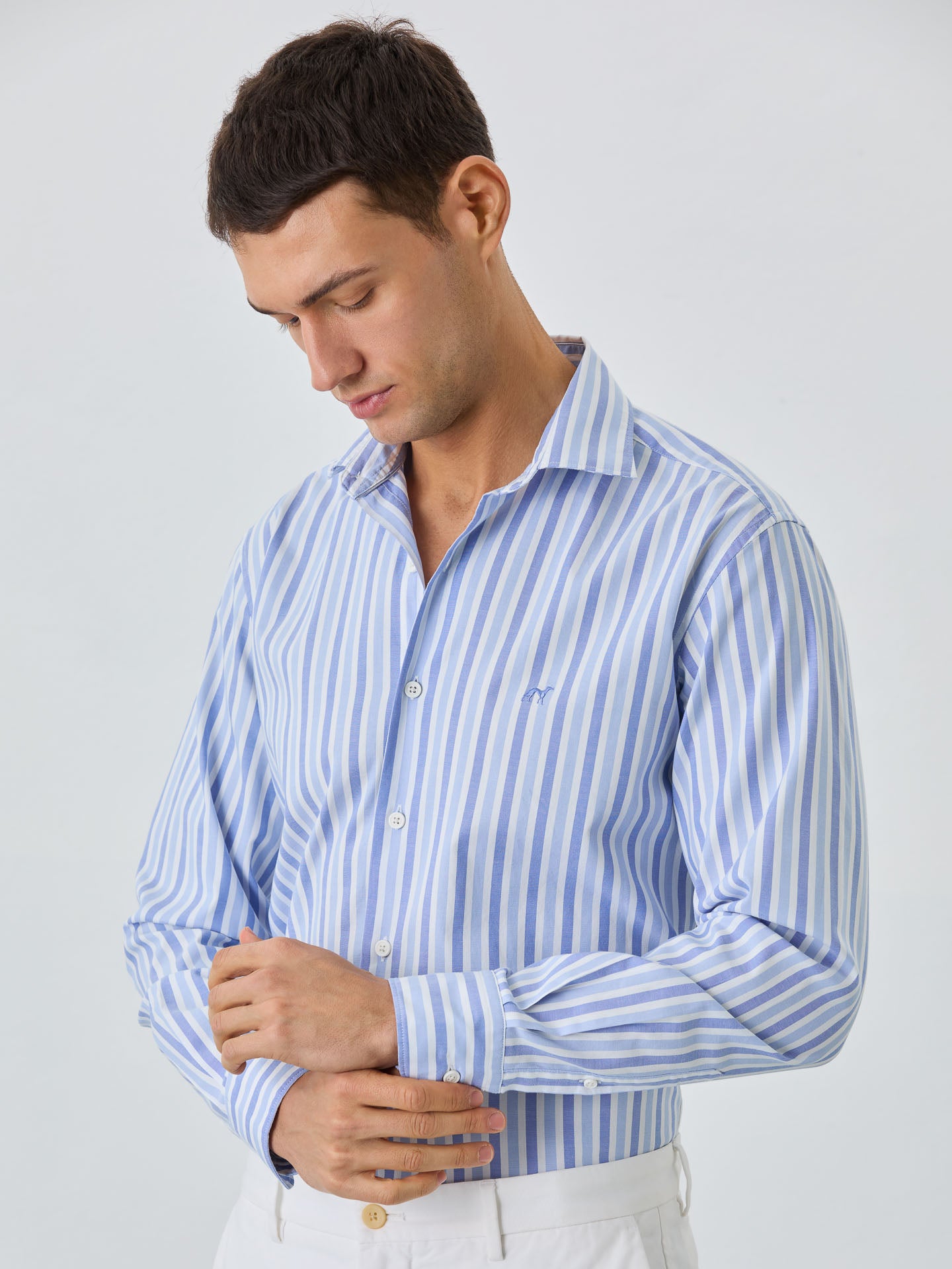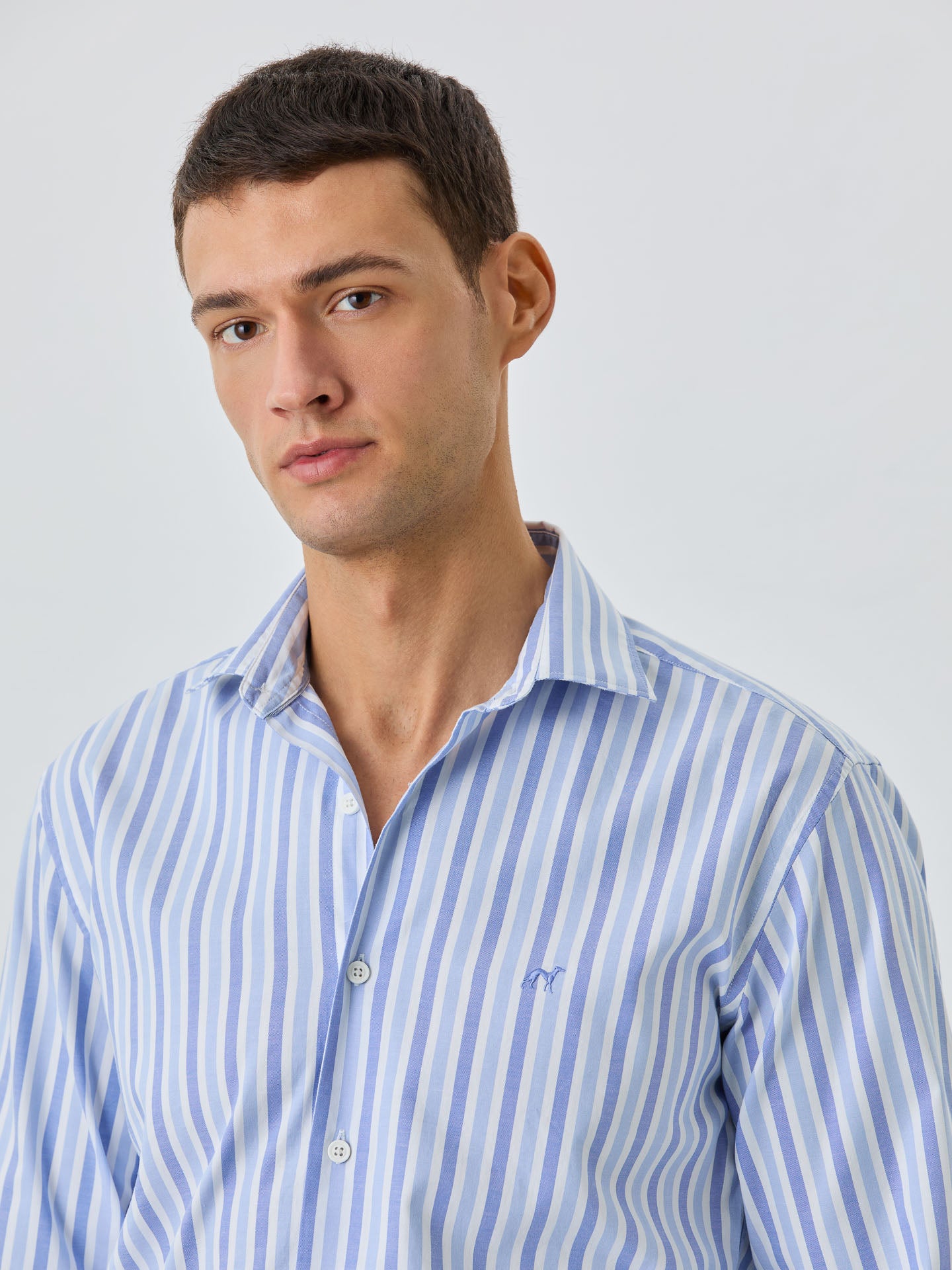 Slim Fit Shirt With Open Collar In BCI Cotton With Stripes