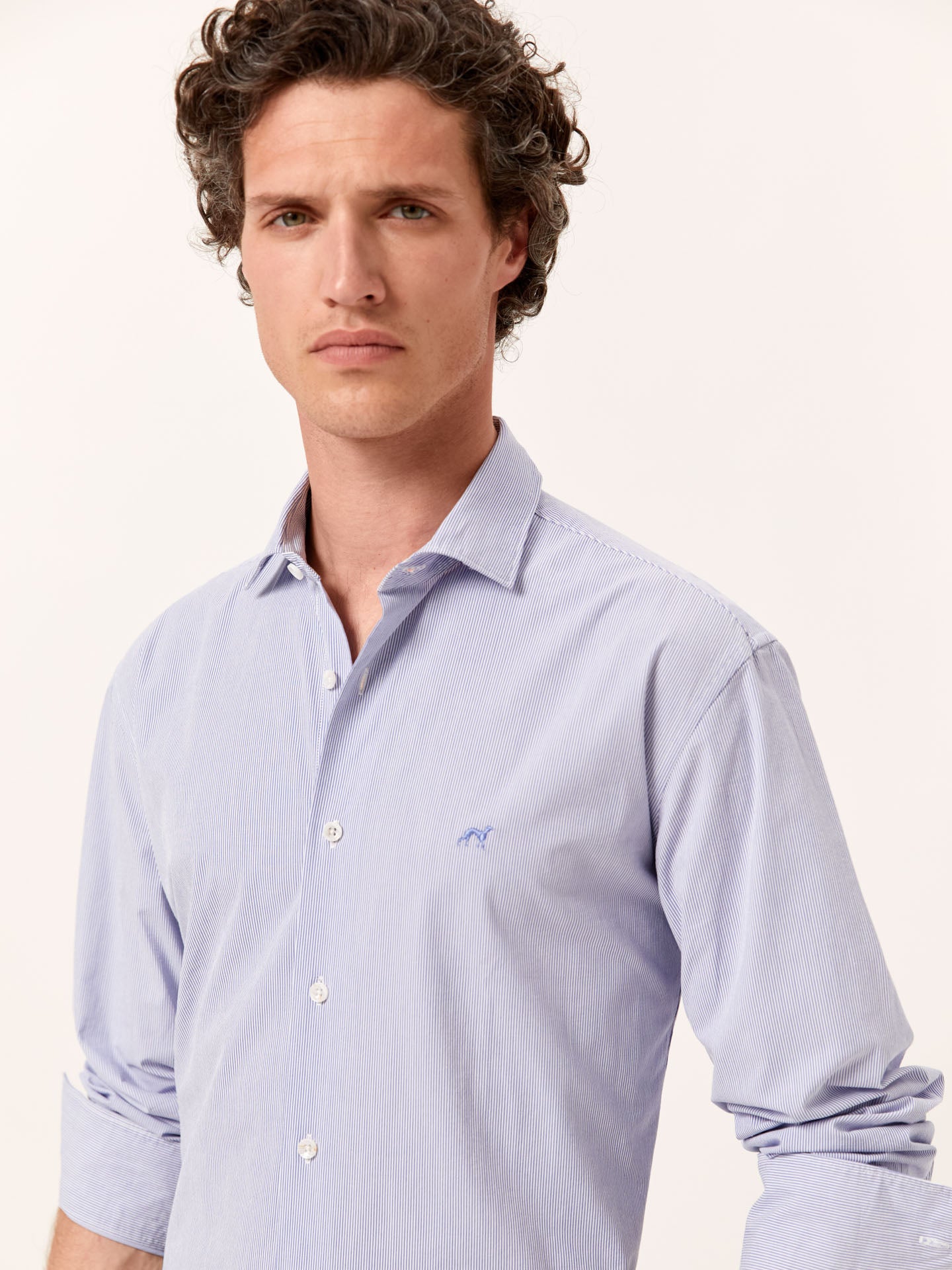 Slim Fit Striped Seersucker Shirt in Cotton Elastane with Open Collar