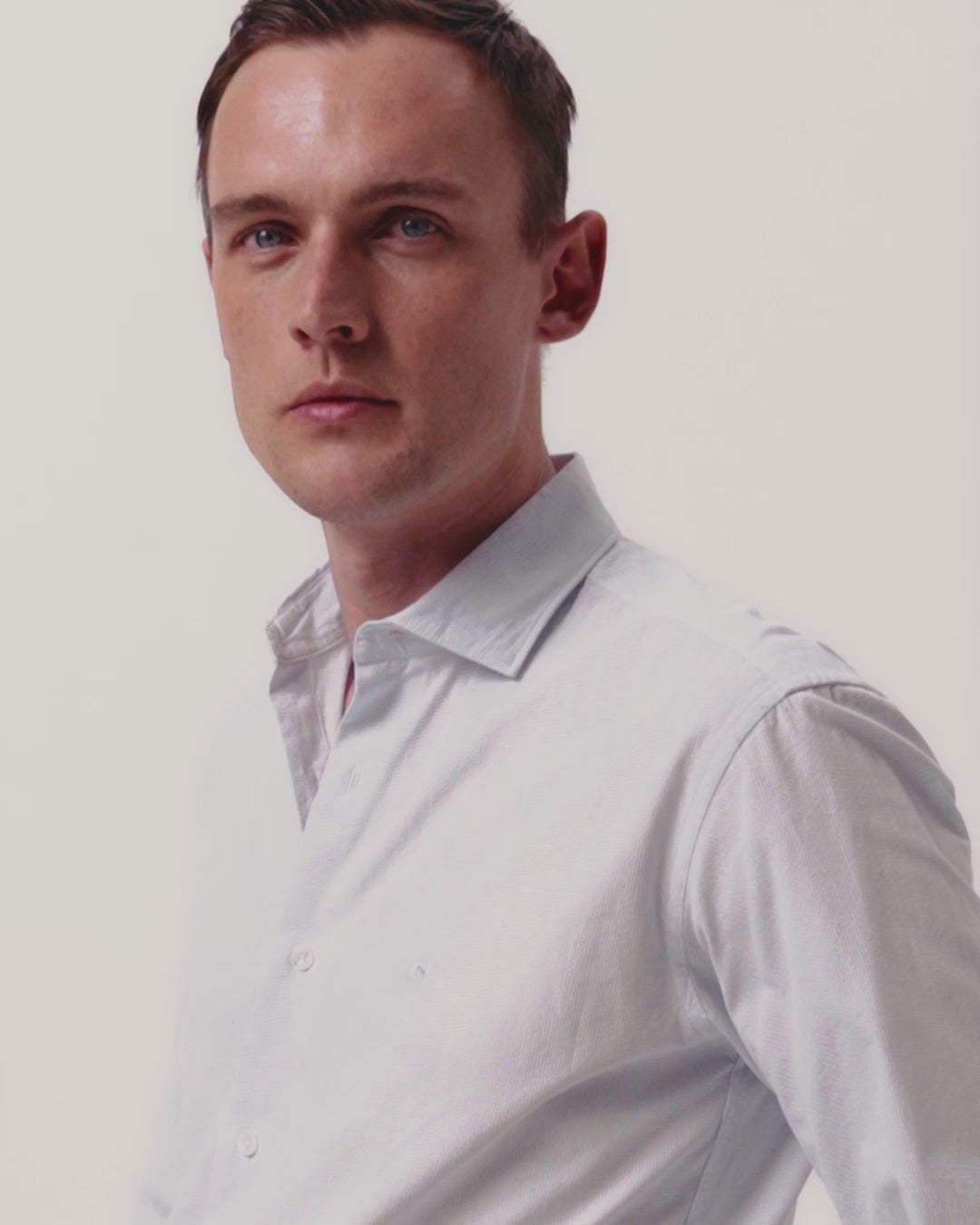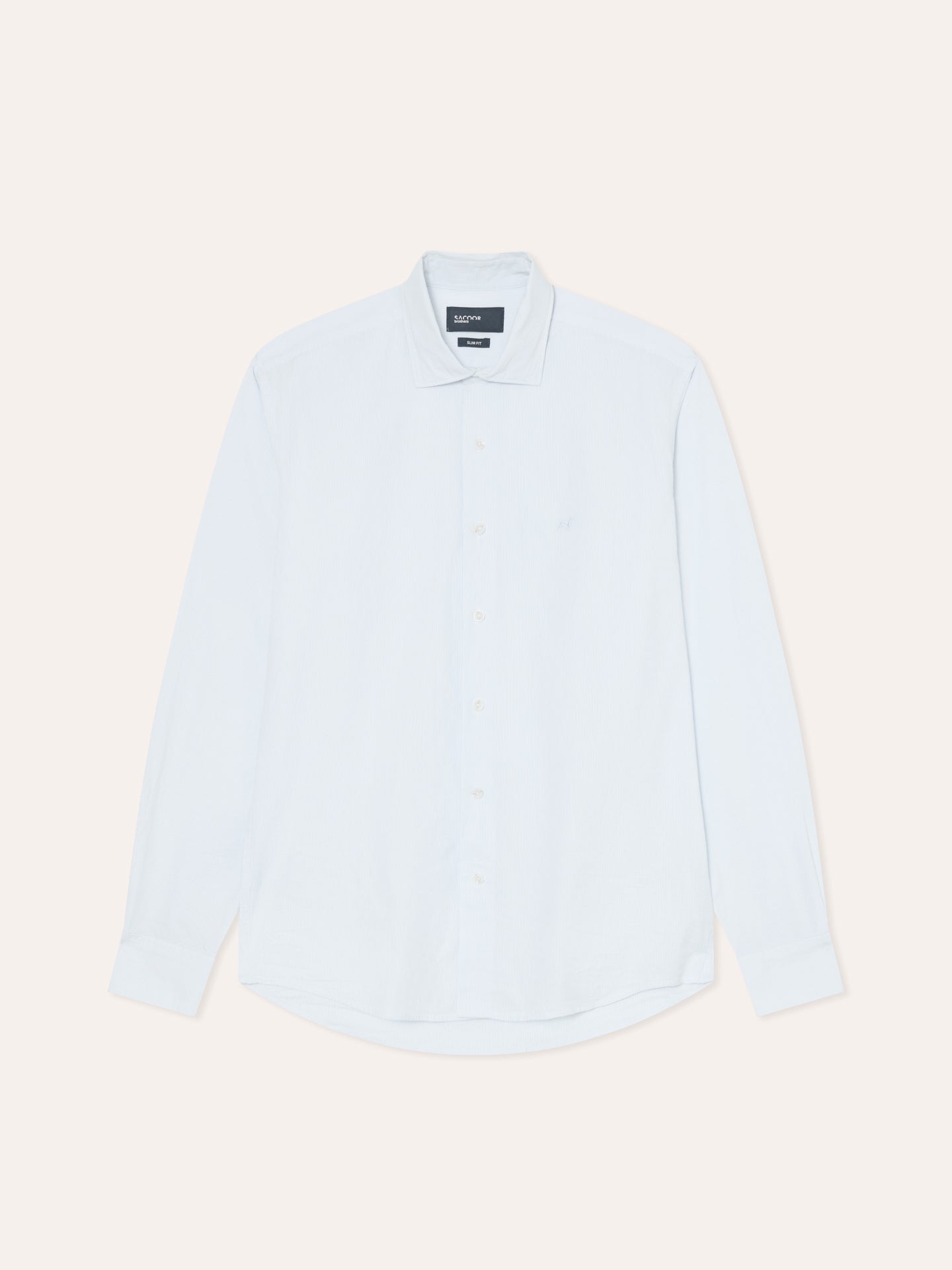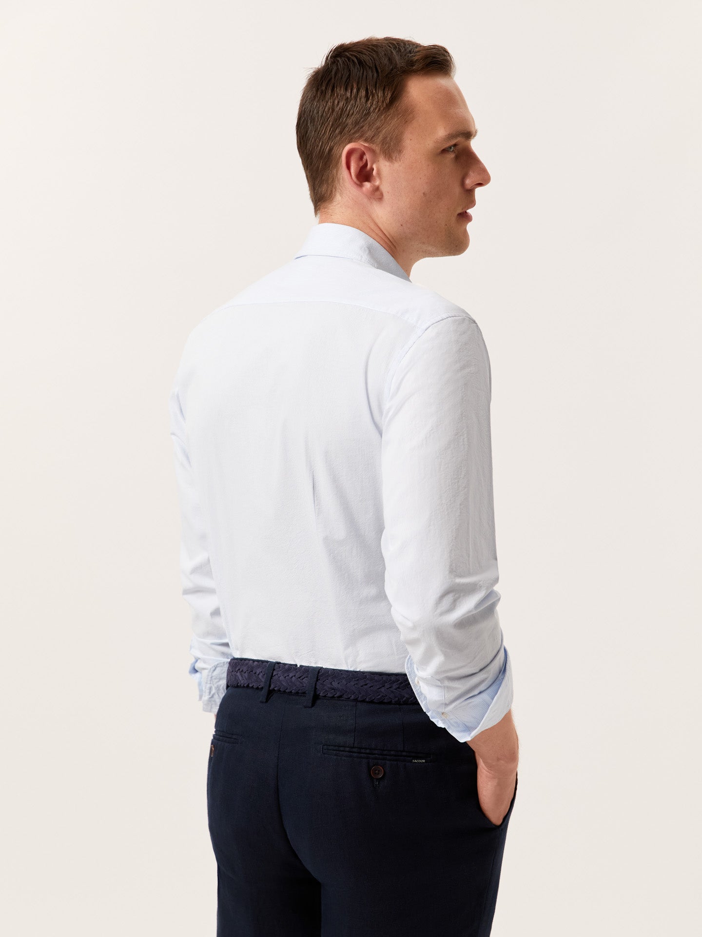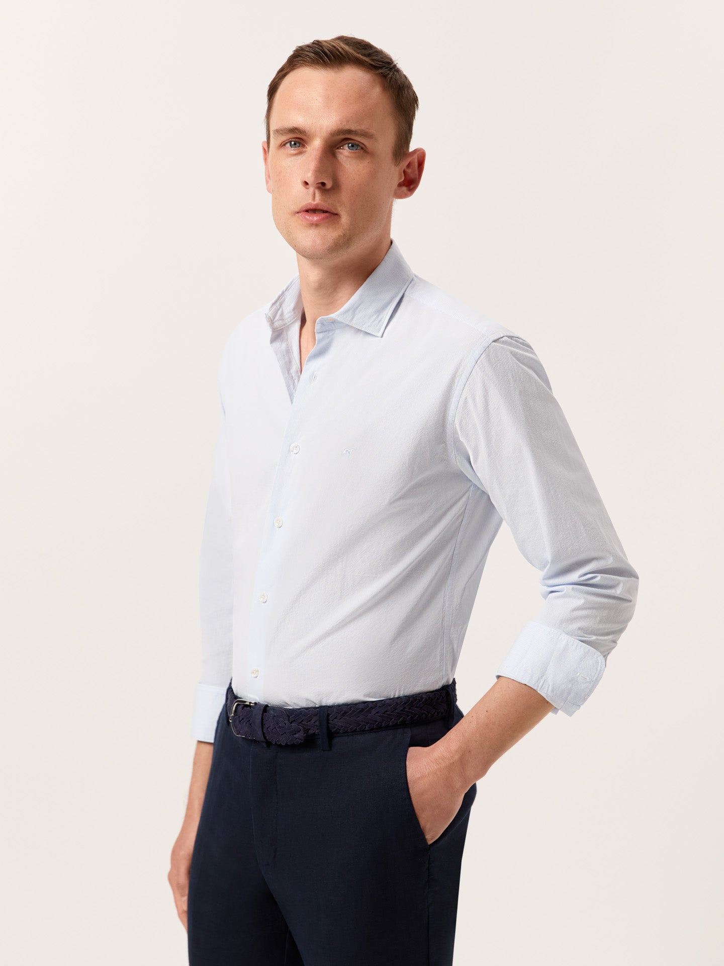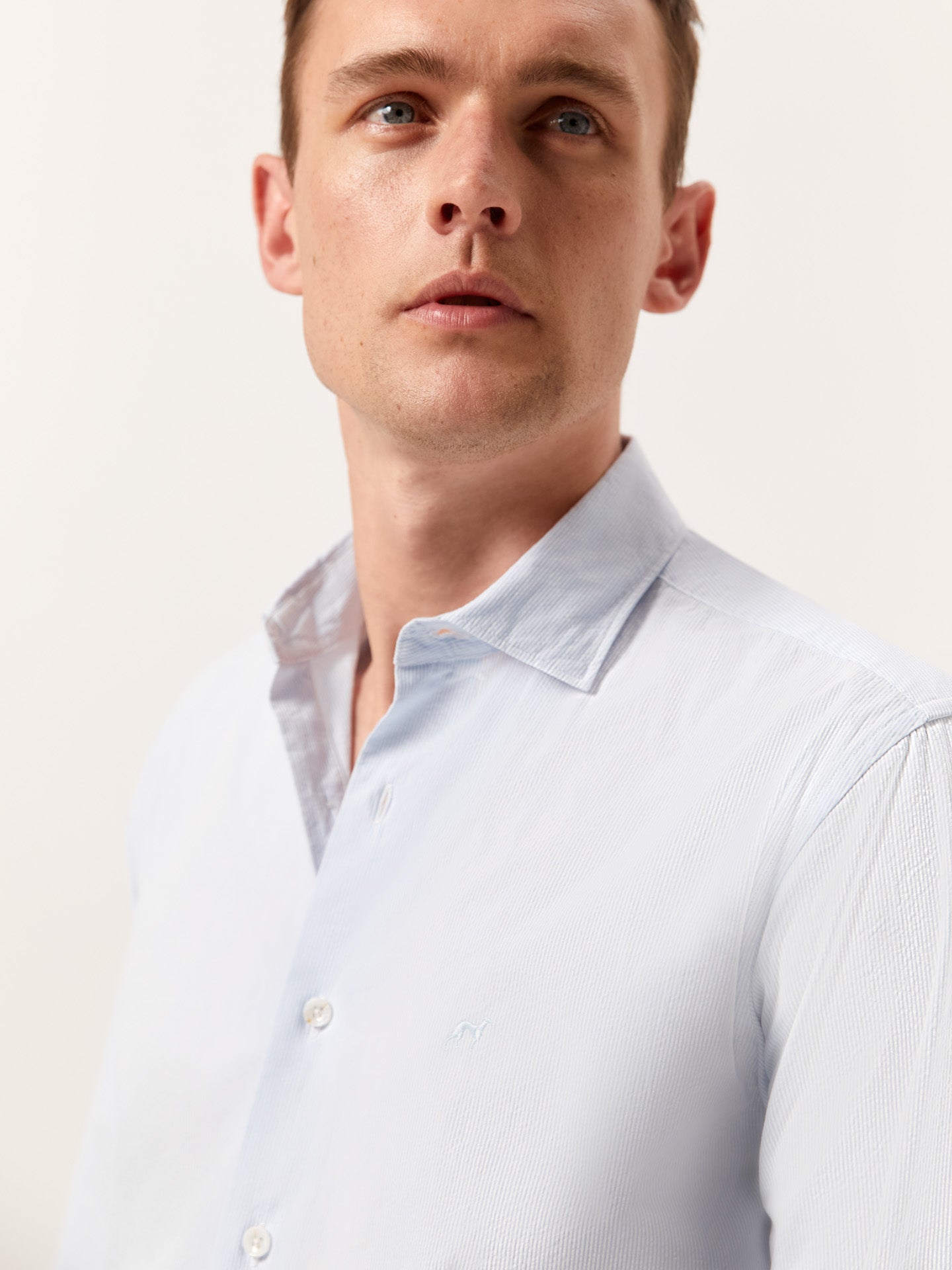 Slim Fit Striped Seersucker Shirt in Cotton Elastane with Open Collar