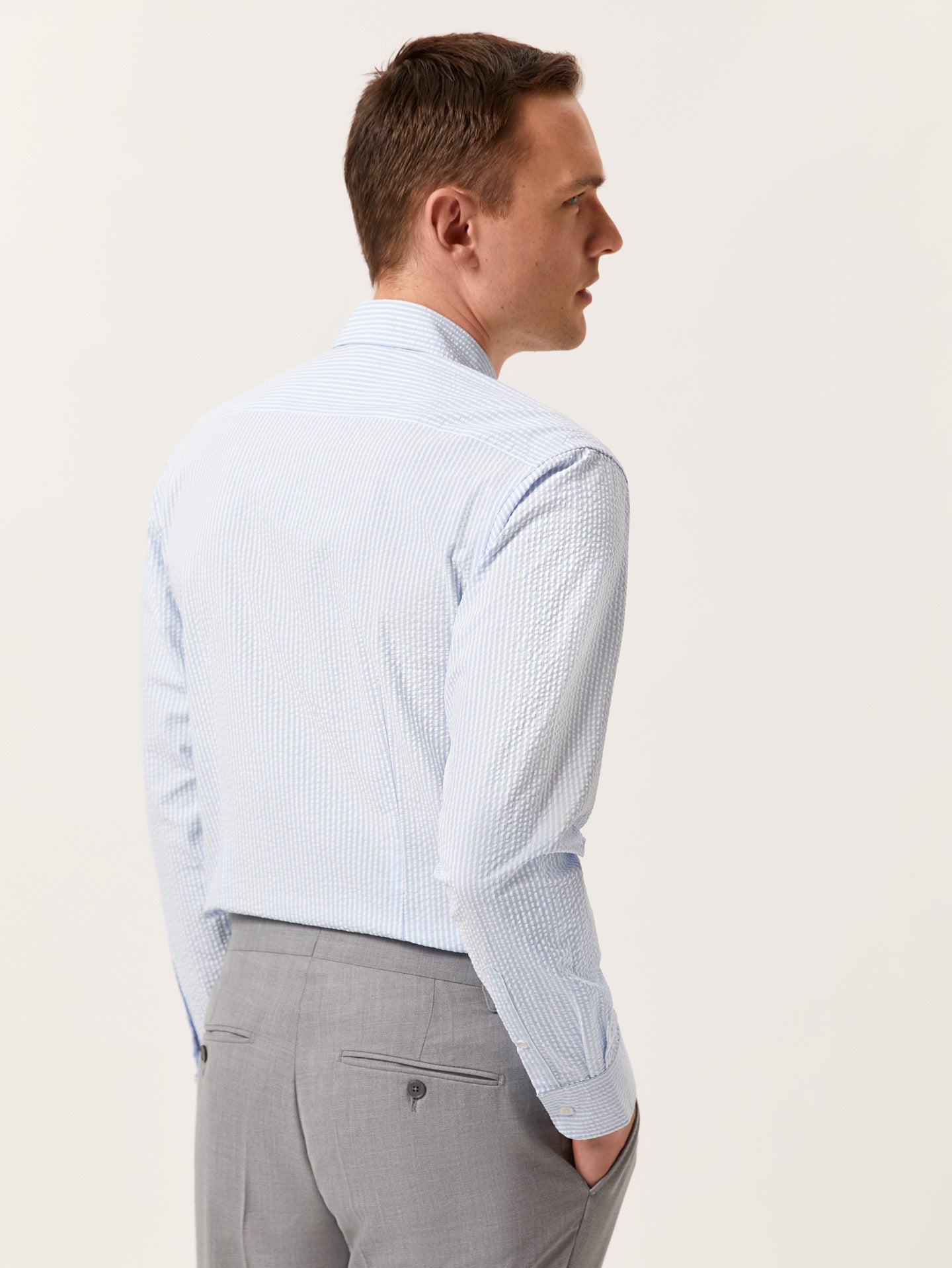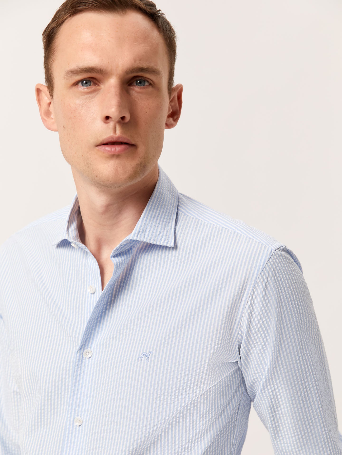 Slim Fit Striped Seersucker Shirt in Cotton Elastane with Open Collar