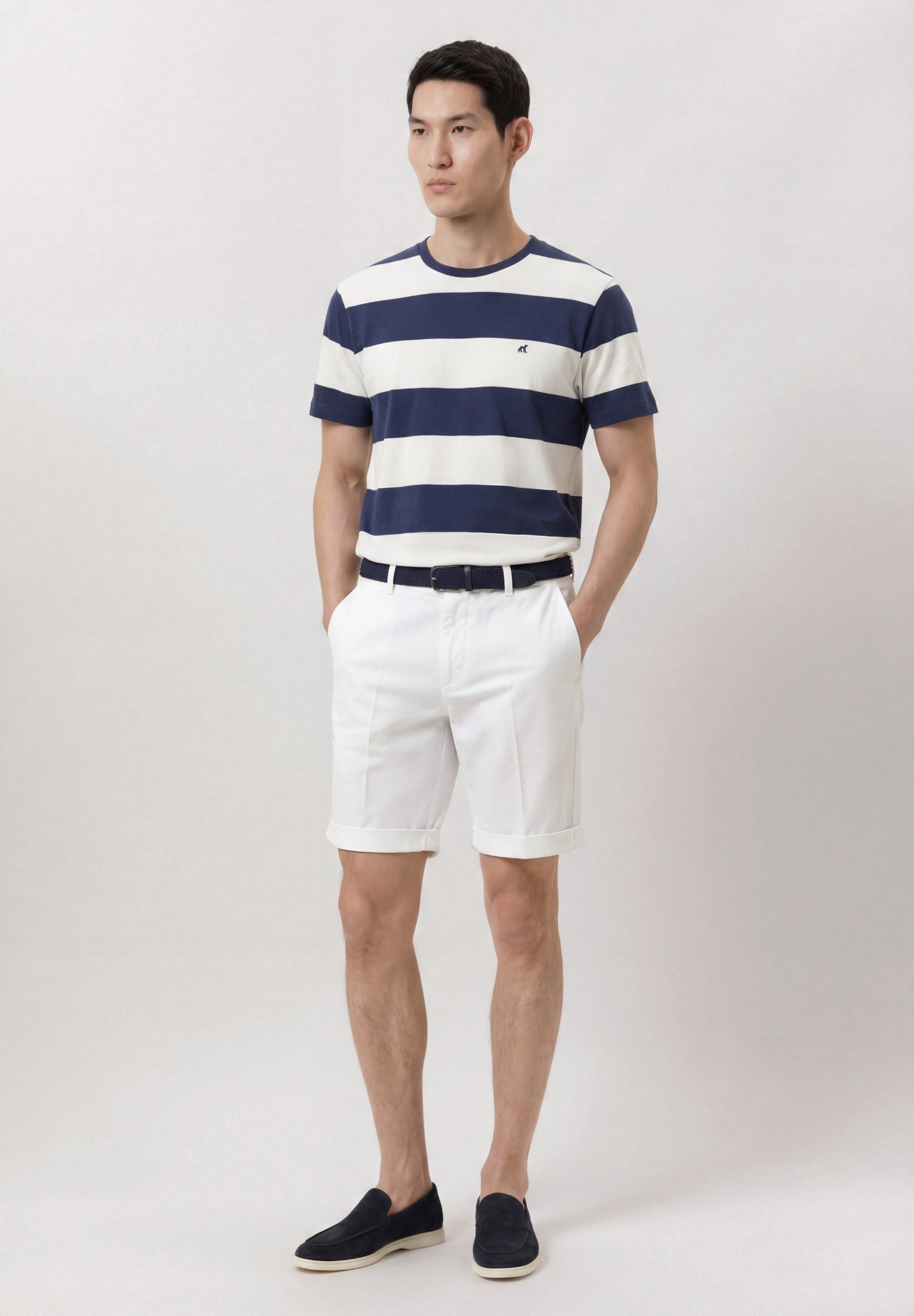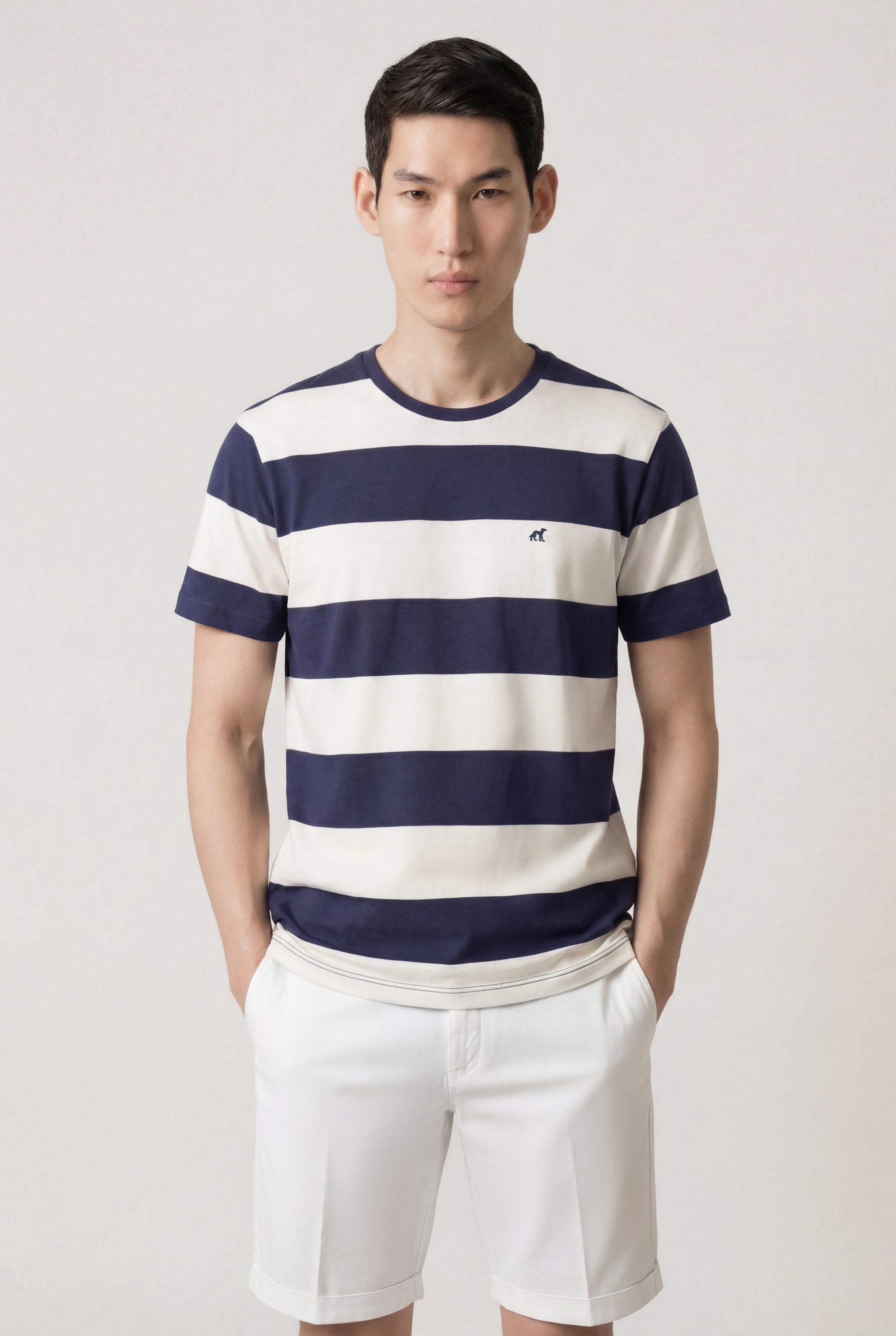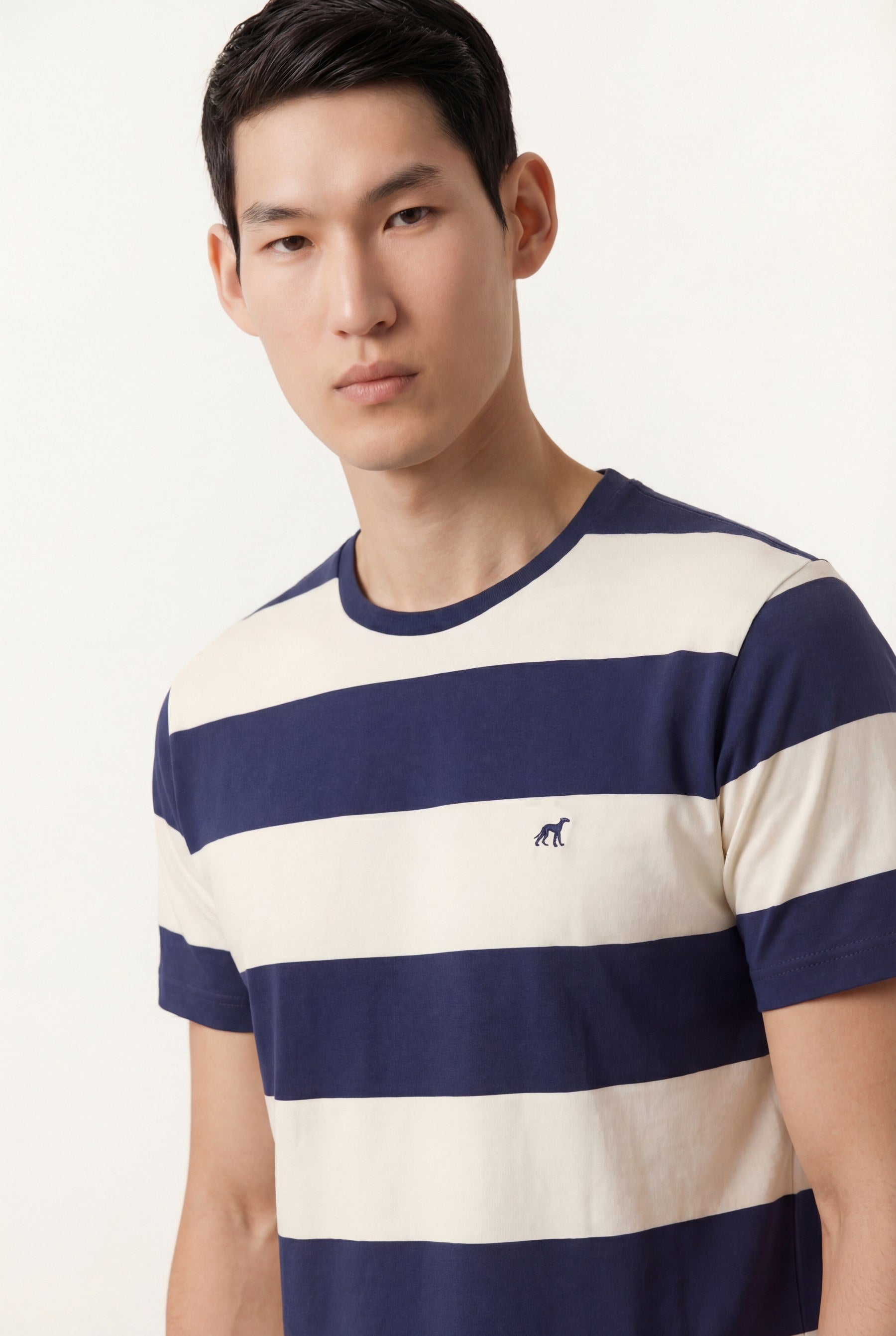 Short sleeve t-shirt made from 100% organic cotton single jersey. Designed with a yarn-dyed stripe pattern and a self-fabric collar. Features stitching detail at the shoulder seams and self-fabric cleaning tape inside neckline . Finished with sleeve and body hems in matching color and a matching color chest logo embroidery in cotton thread.